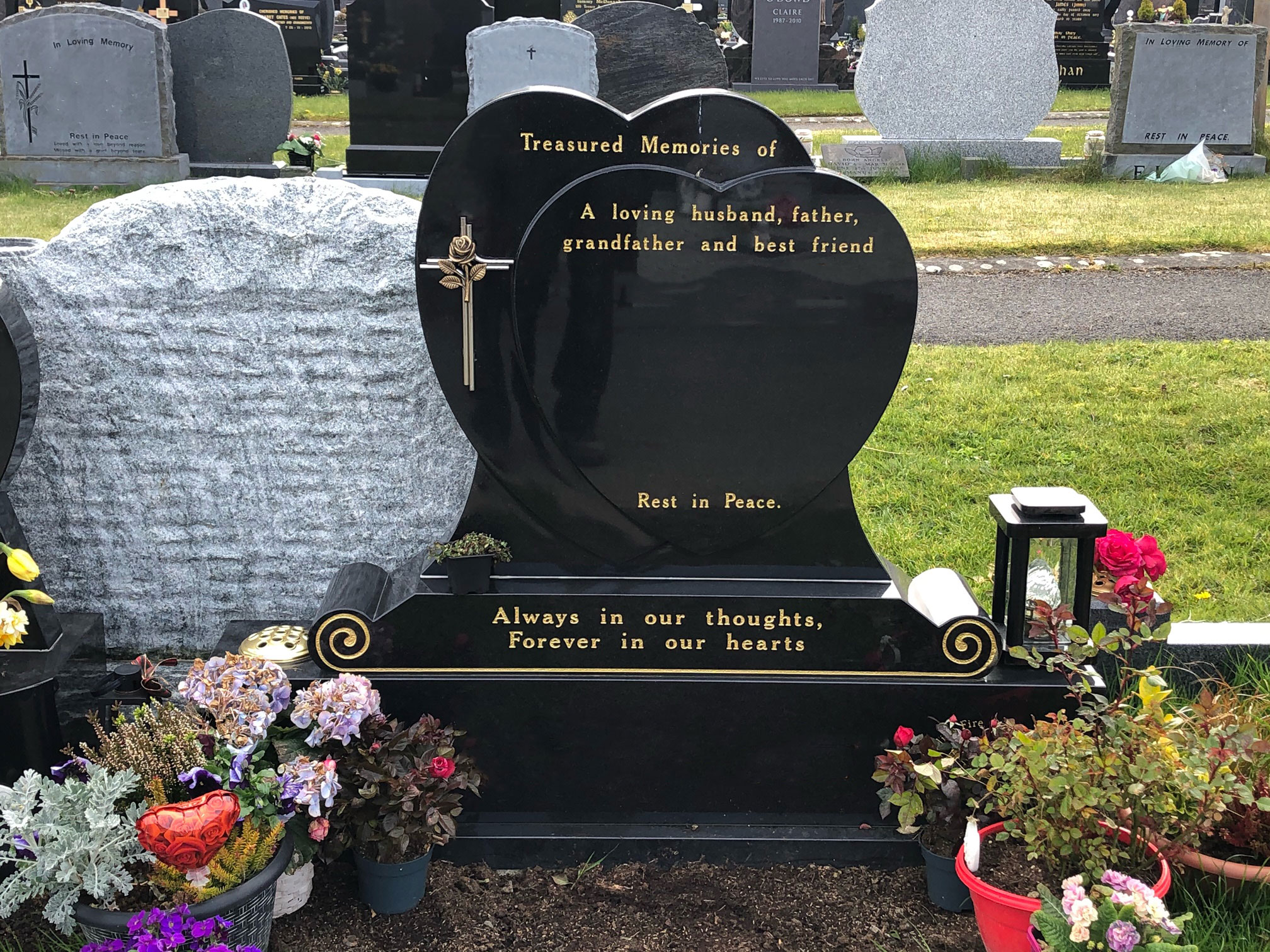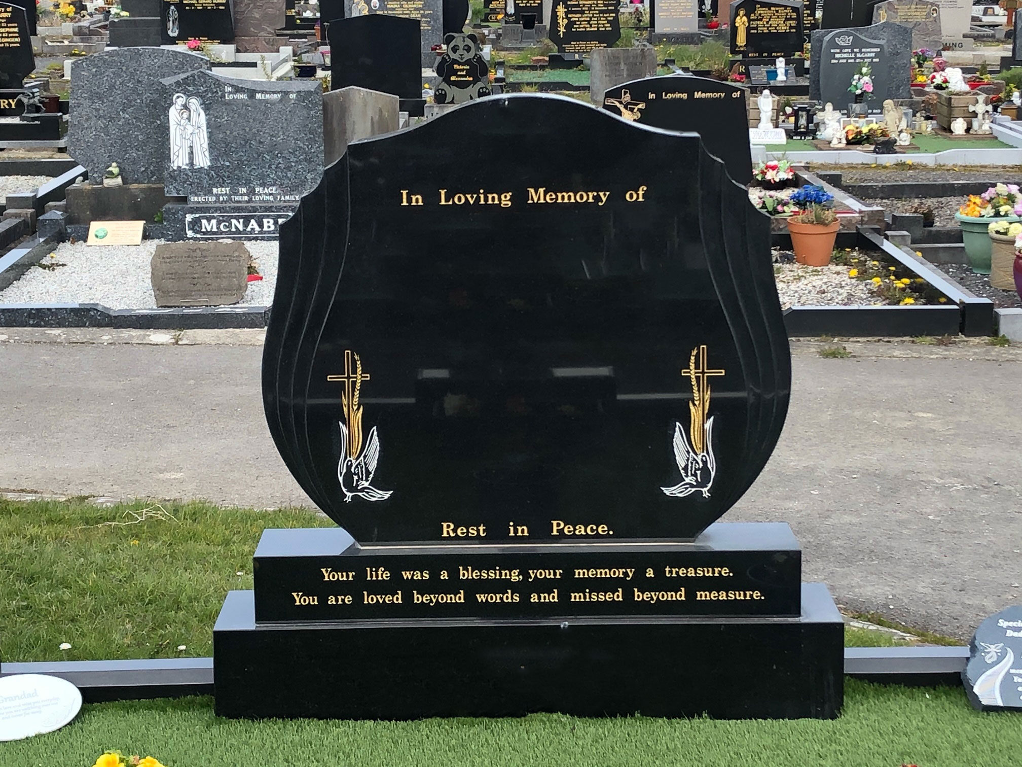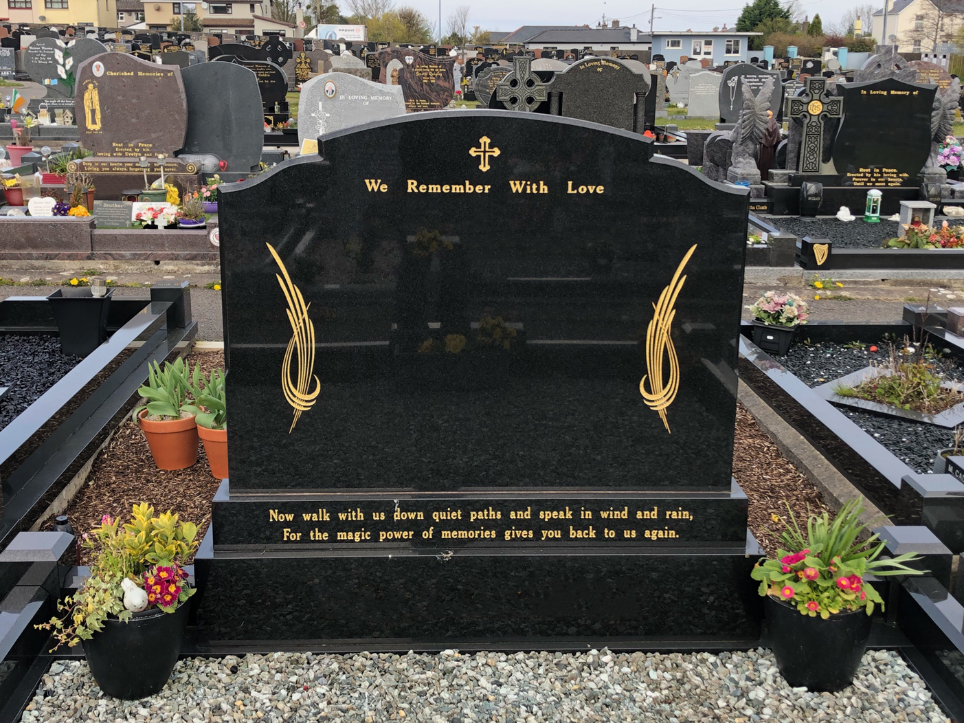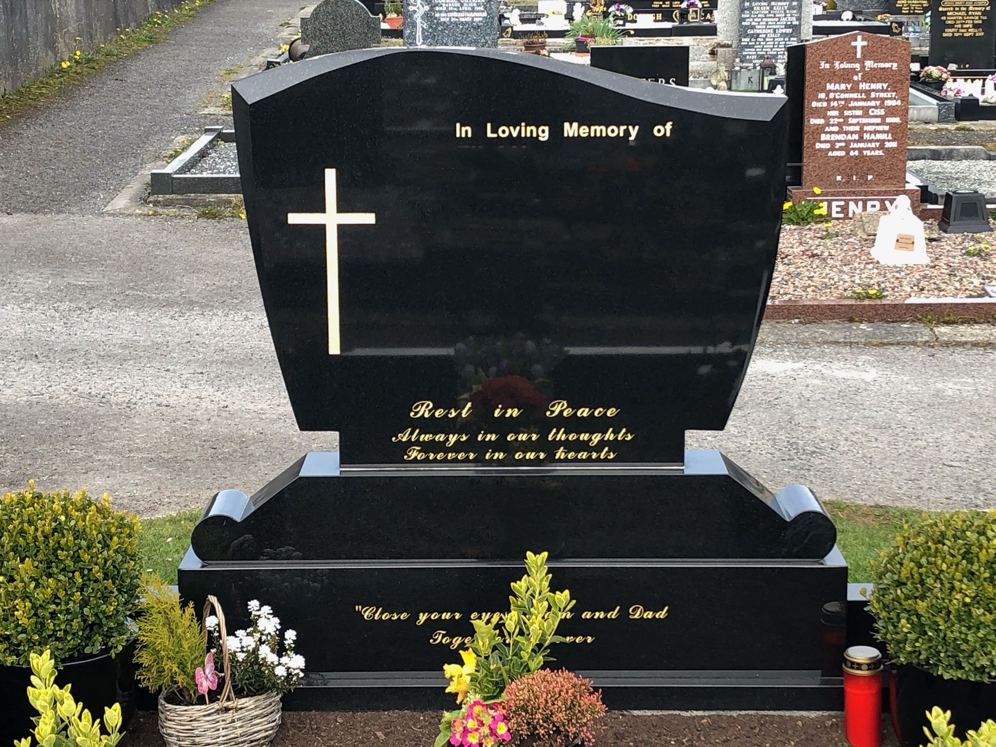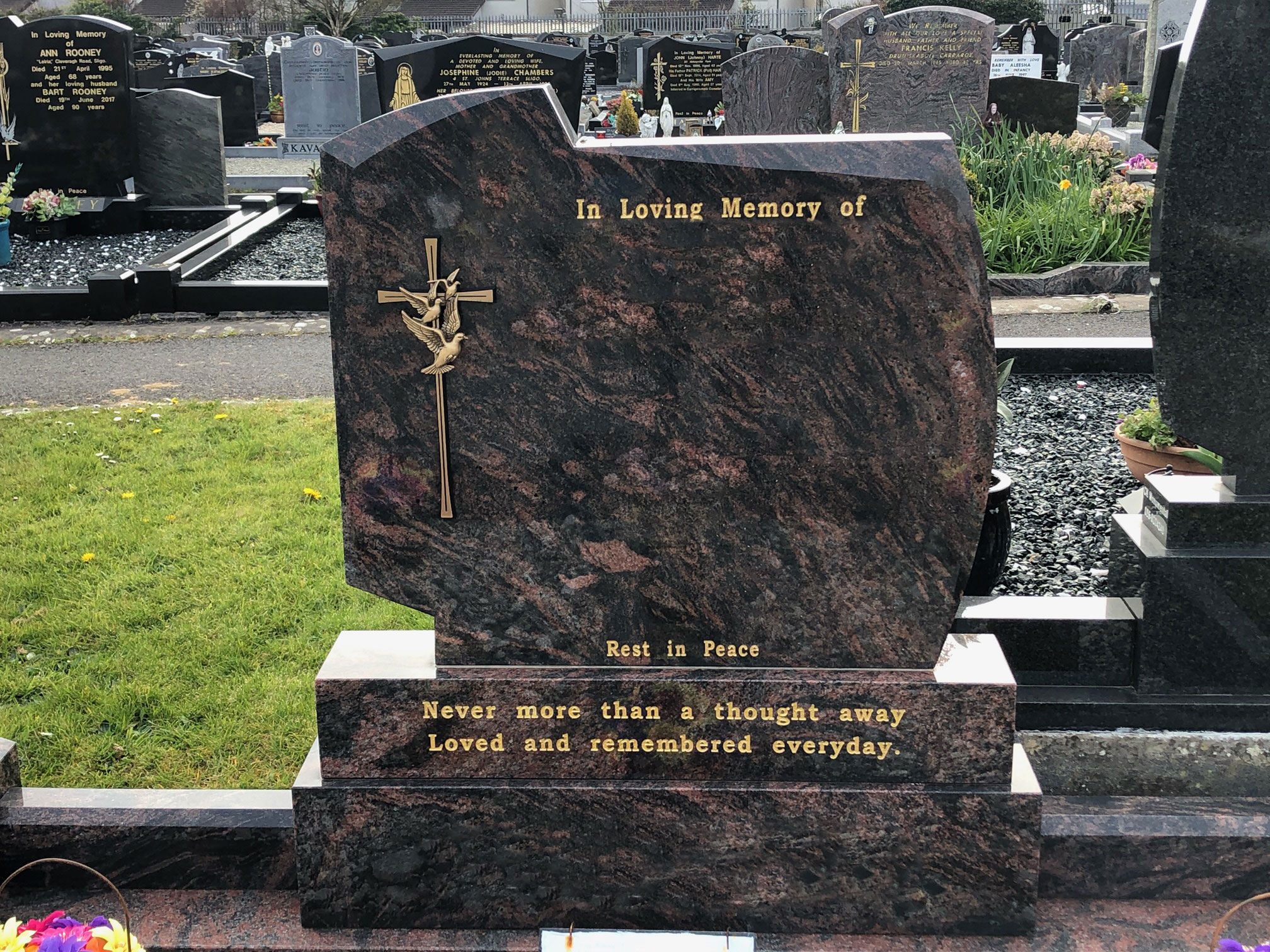 Choosing a headstone for a grave can be difficult to do, which is why our team offers professional and compassionate advice throughout the process providing you with assistance and support when you need it. If you are unsure what headstone you should choose,please visit our showroom in Sligo where you can see a full range of options and receive our brochure.